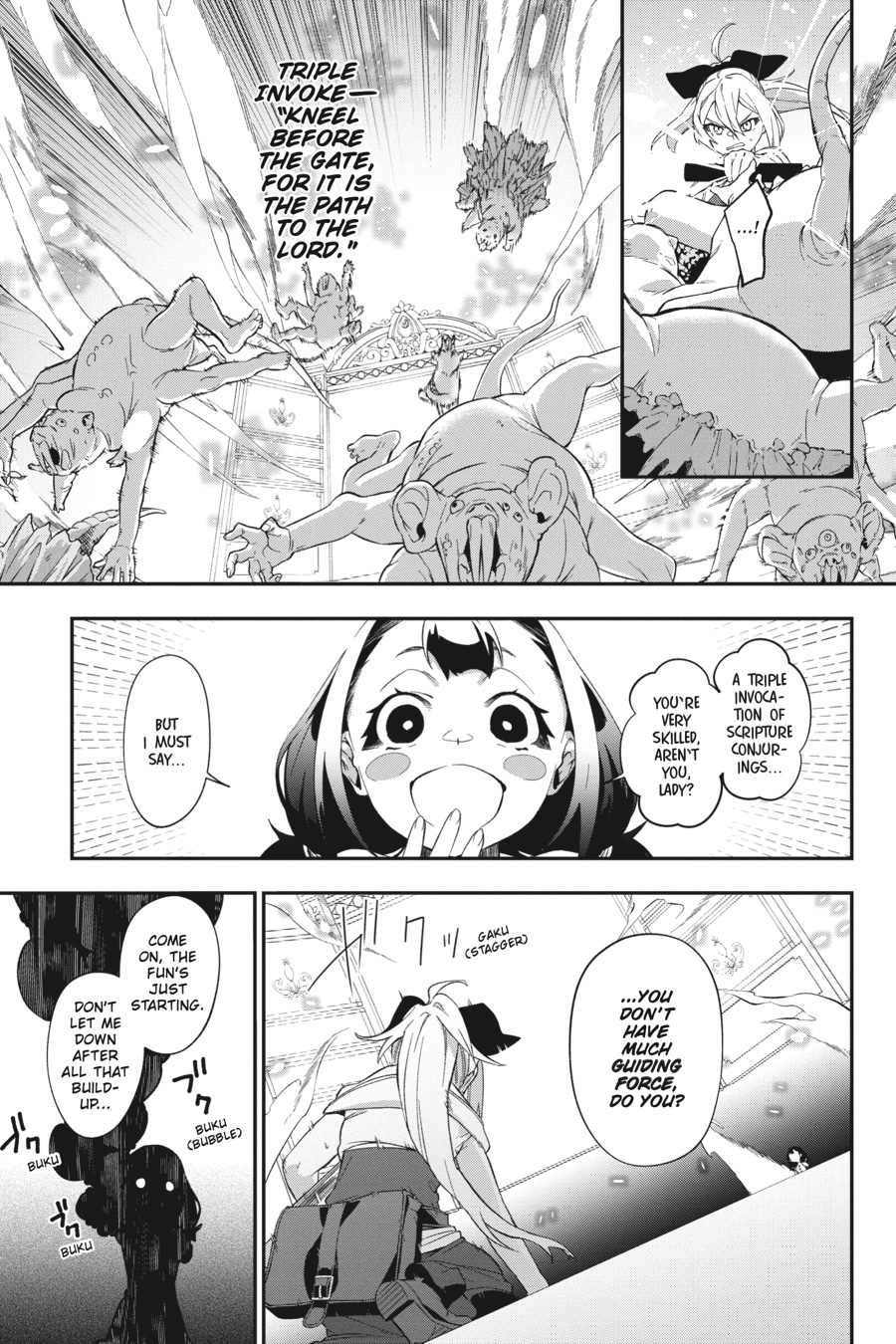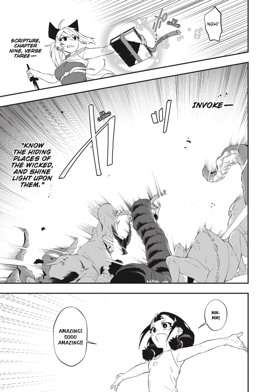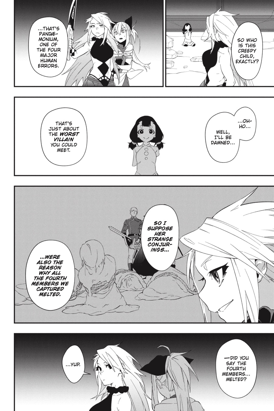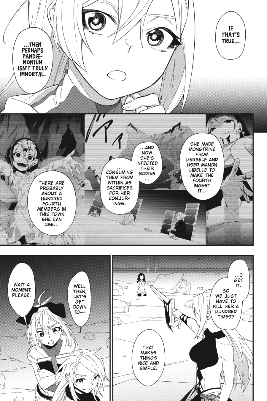 Menou and her allies succeed in executing the mastermind behind the drug monstrine, but now they must face their true enemy—one of the Four Major Human Errors who once destroyed the world, Pandæmonium. The little girl is the concept of Evil brought to life, and she can create countless monsters from her flesh, revive herself at will, and kill for mere entertainment. Against her overwhelming power, Menou is backed into a corner...but with the help of Akari and a certain Princess Knight, can she manage to turn the tables?