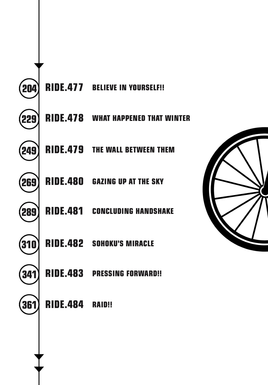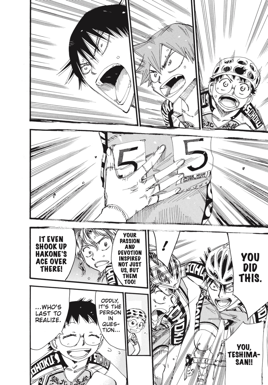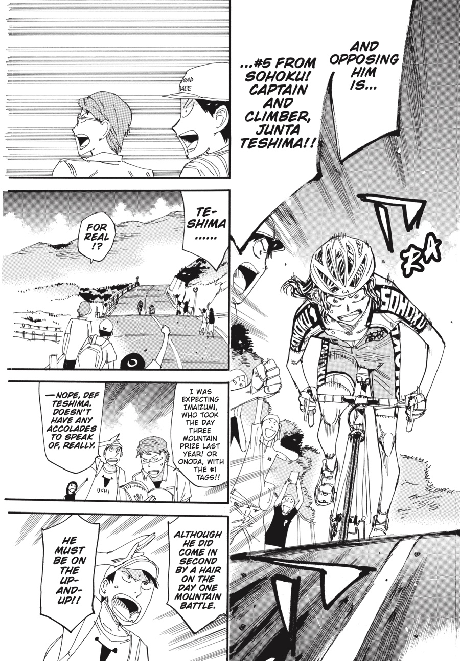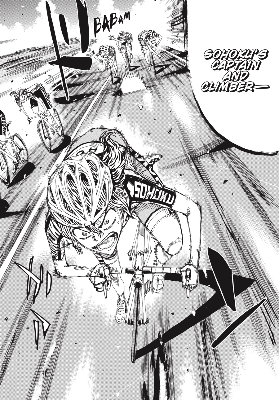 Final day, final climb. Thanks to Hakone captain Izumida’s excellent sprint on the very last stretch of the flats, Sohoku is stuck desperately chasing after them. However, because of the efforts of Aoyagi, Kaburagi, and now Teshima, Sohoku has once again caught up to their archrivals! But Hakone won’t go down without a fight—which is why Teshima and Ashikiba are in a passionate climber’s clash while jockeying for the best possible position for their team...!