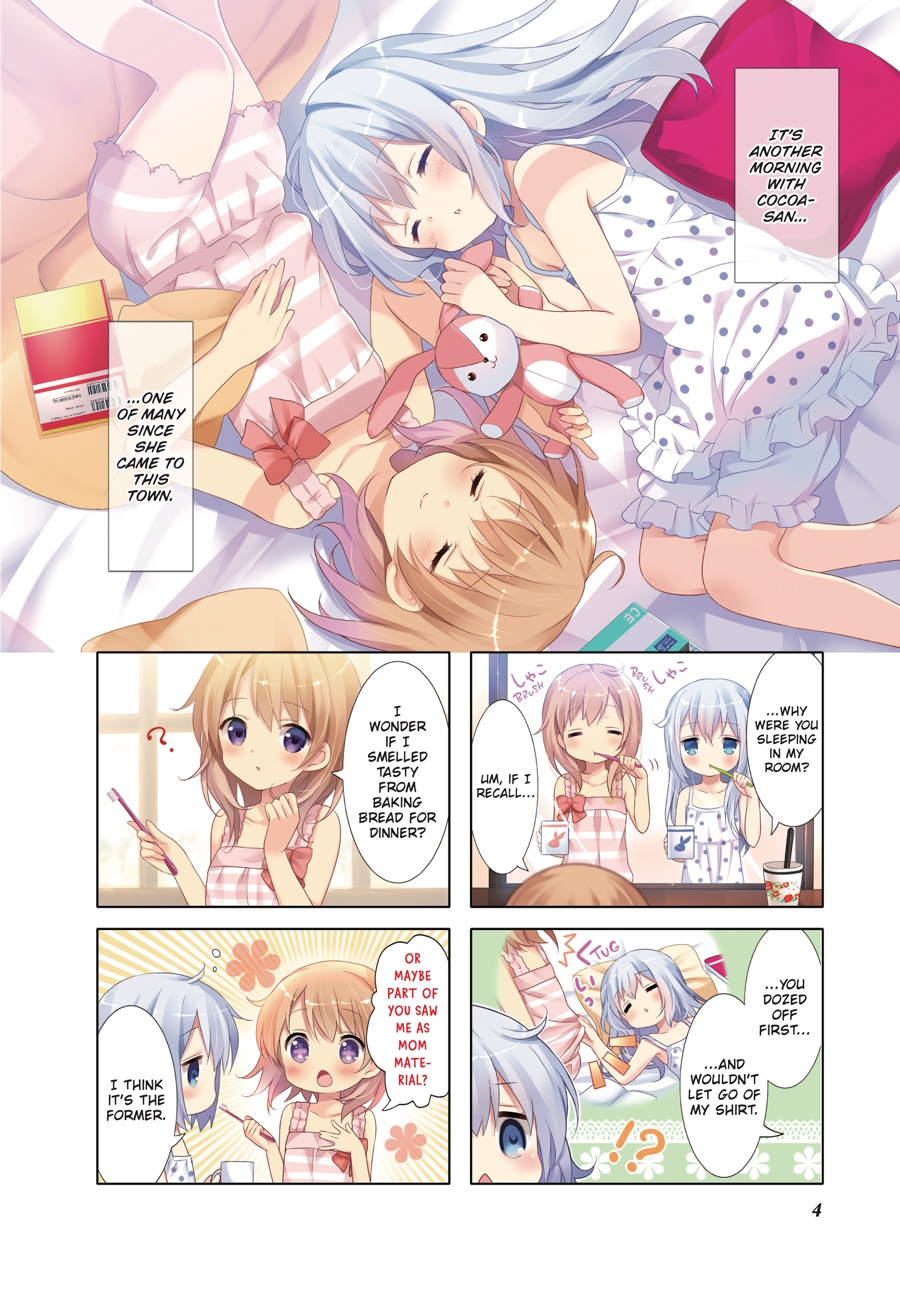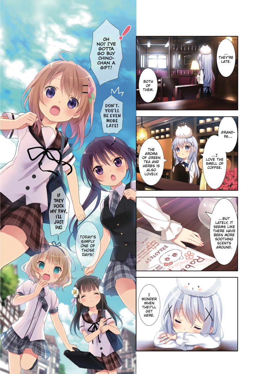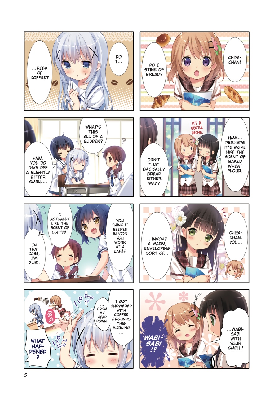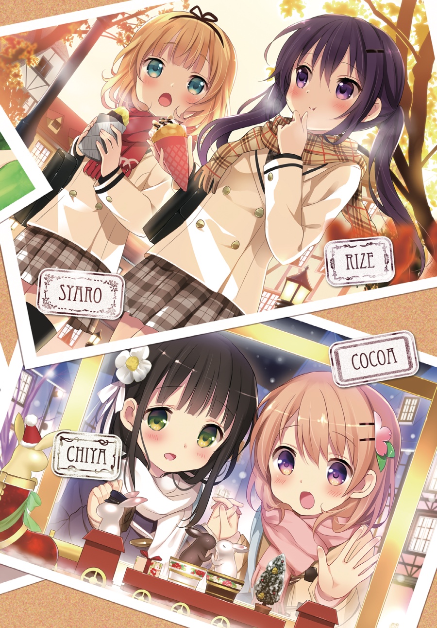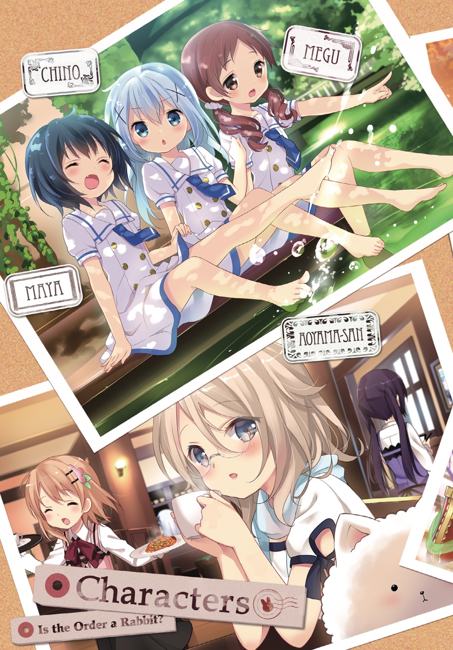 After stumbling across her homestay by sheer coincidence, Cocoa’s gotten used to life at Rabbit House Café—and along with Chino, Syaro, Rize, and Chiya, her high school days are filled with fun! Whether it’s practicing sports together or looking after one another, the girls grow closer day by day. And when Chino’s classmates Maya and Megu begin to visit—and the author Aoyama Blue Mountain, a regular, shows up—the café is livelier than ever!