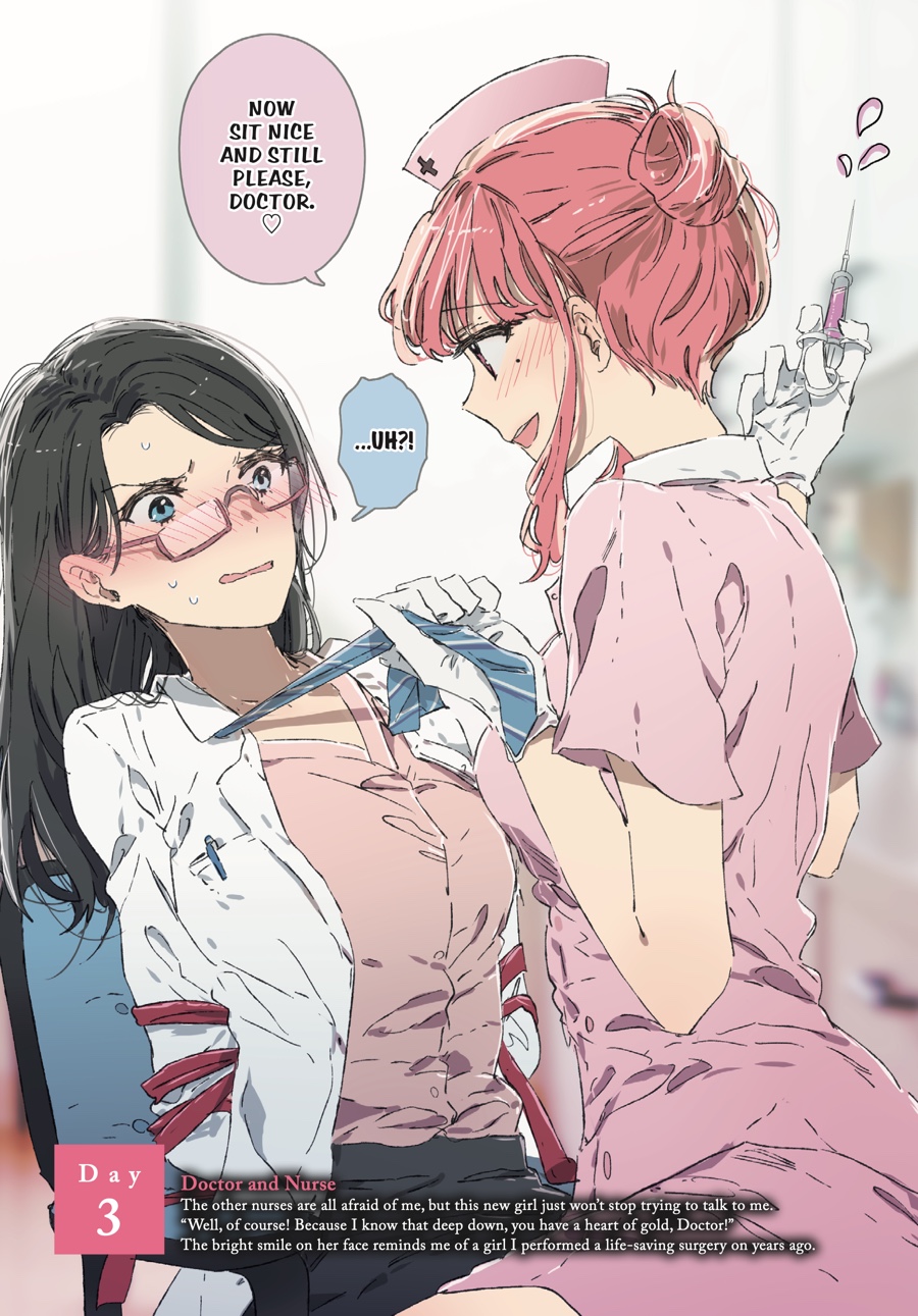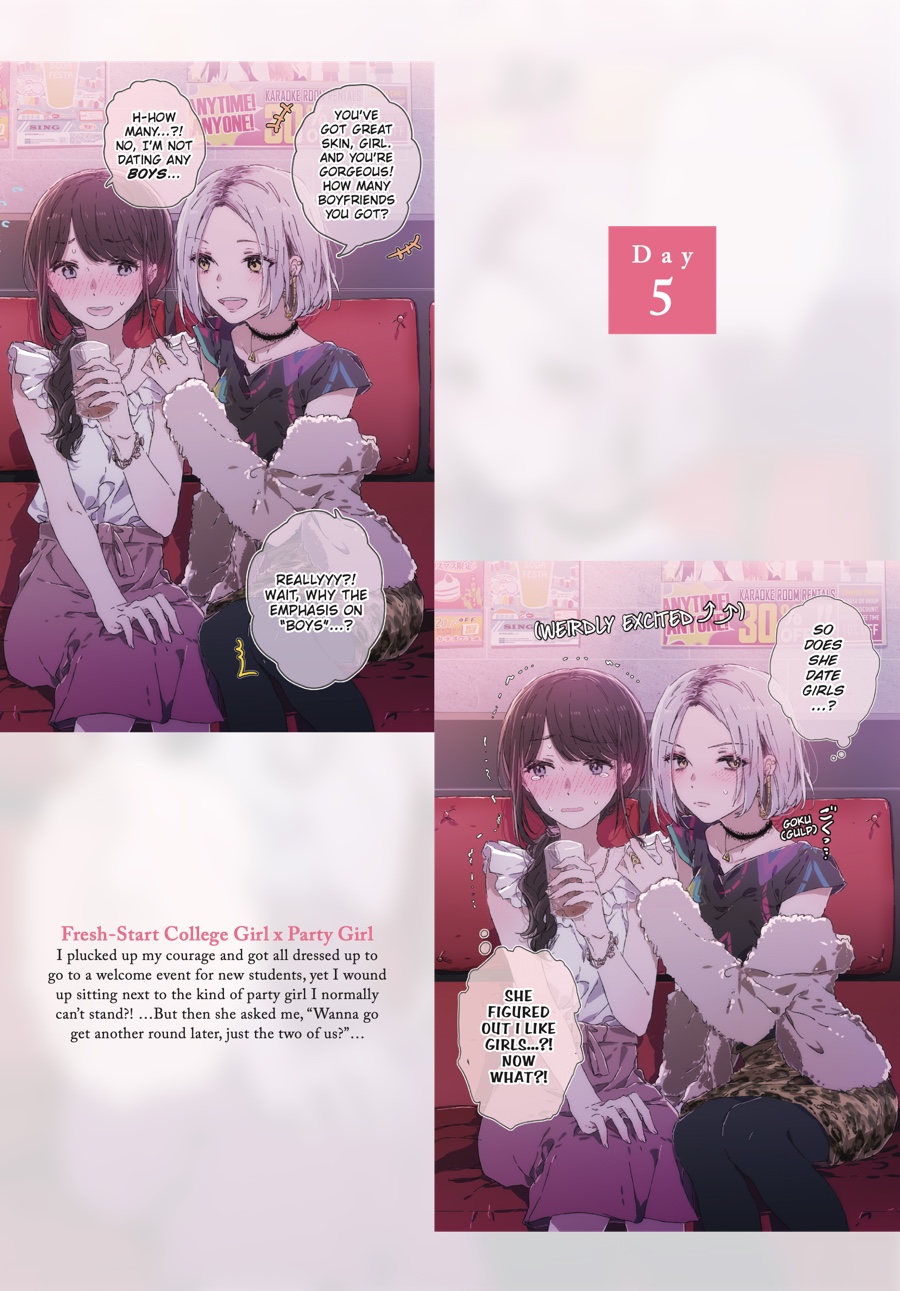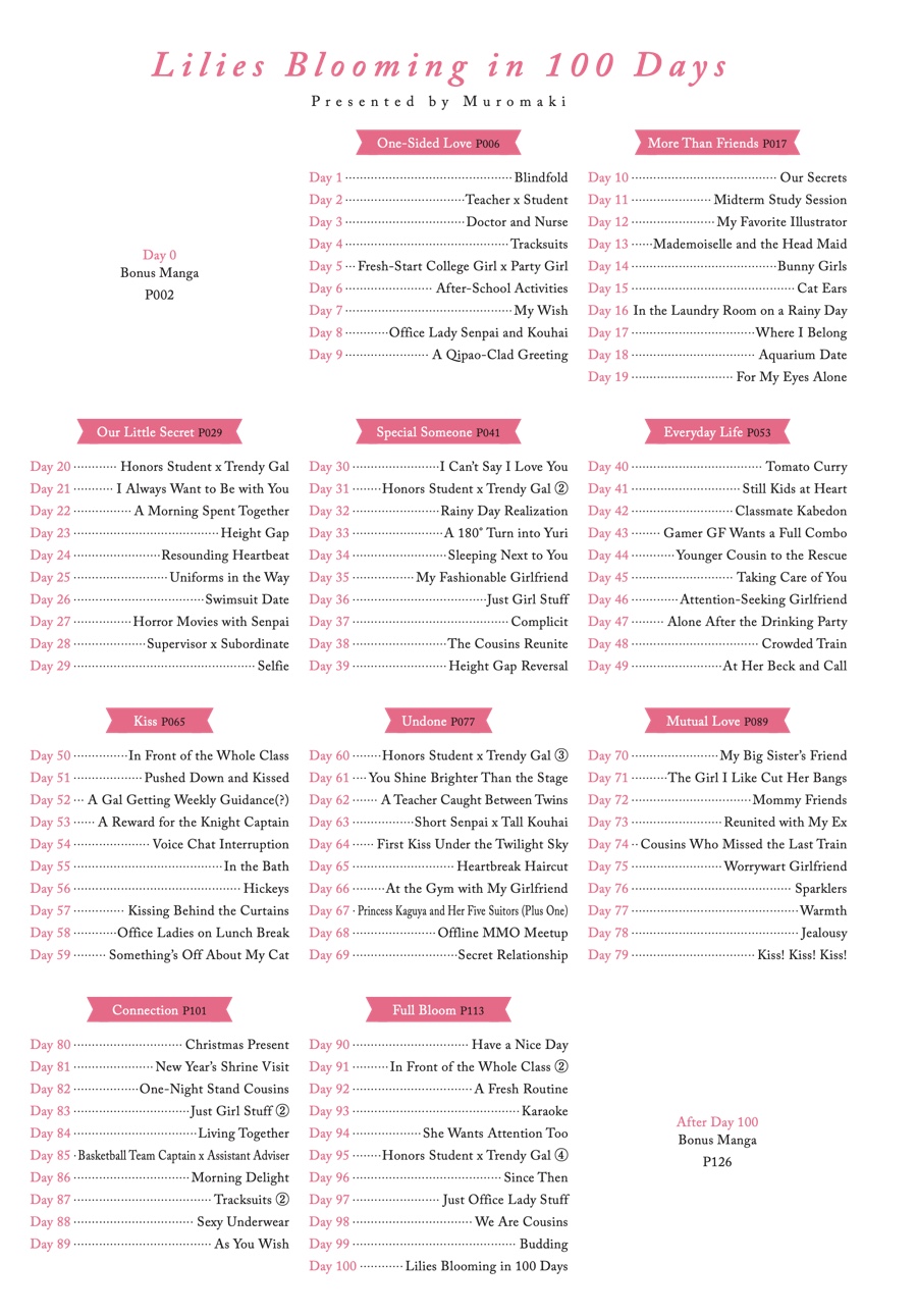 This beautifully illustrated, full-color collection of comics features one hundred different yuri scenes! Packed full of high school, adult, and age-gap couples in cute, funny, and spicy scenarios, this book contains plenty of unique pairings to enjoy. Watch as romance blossoms in classrooms and bedrooms alike!