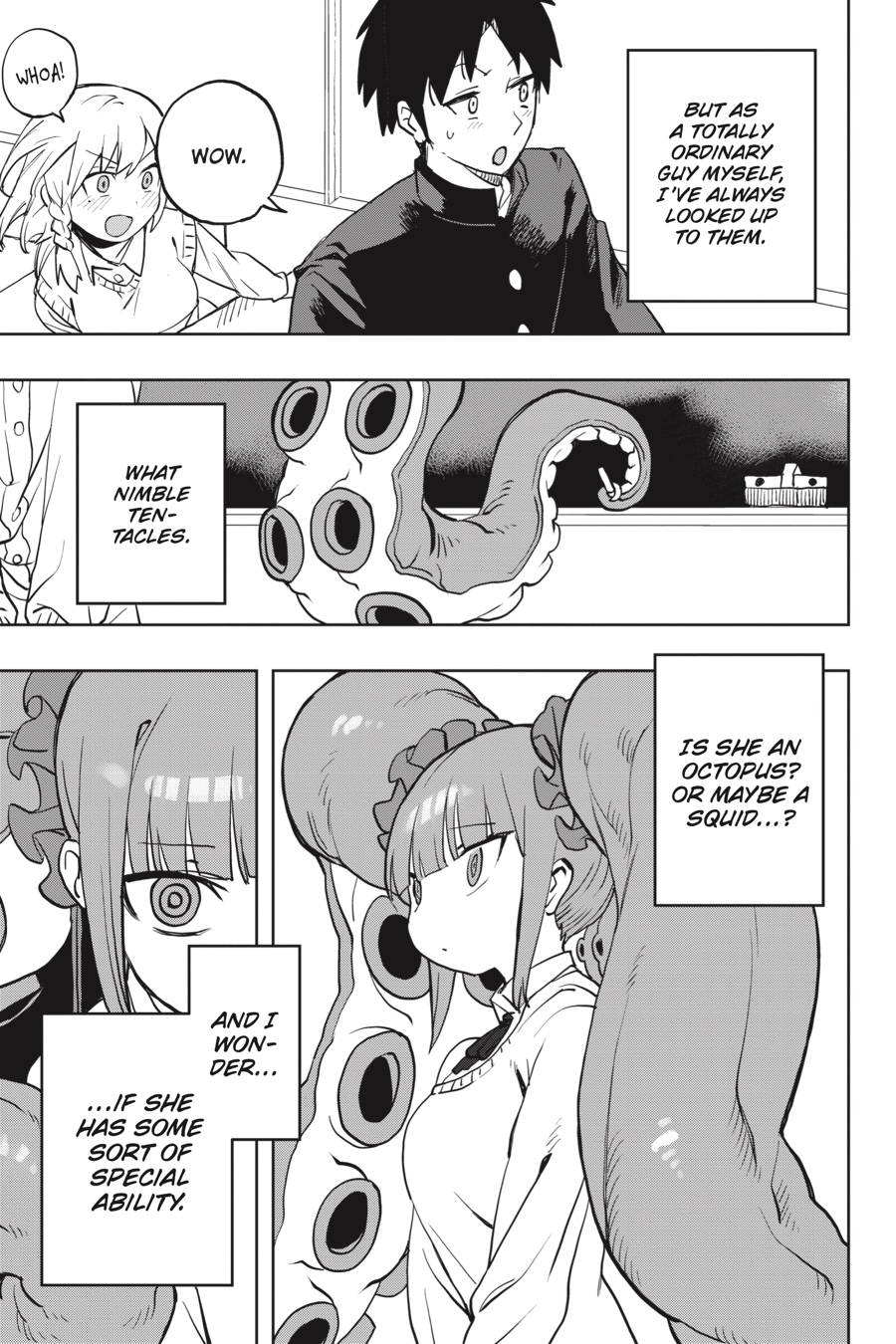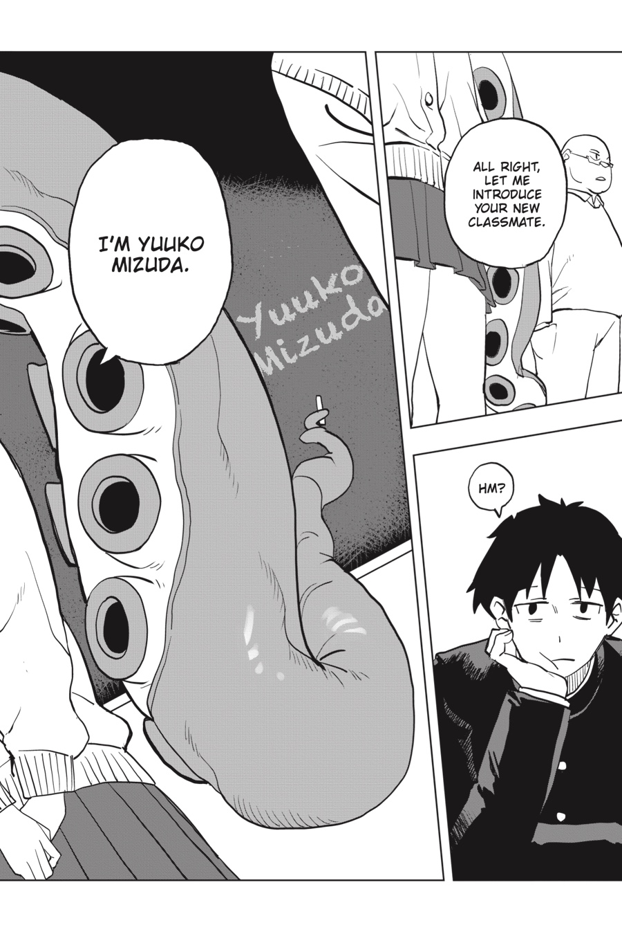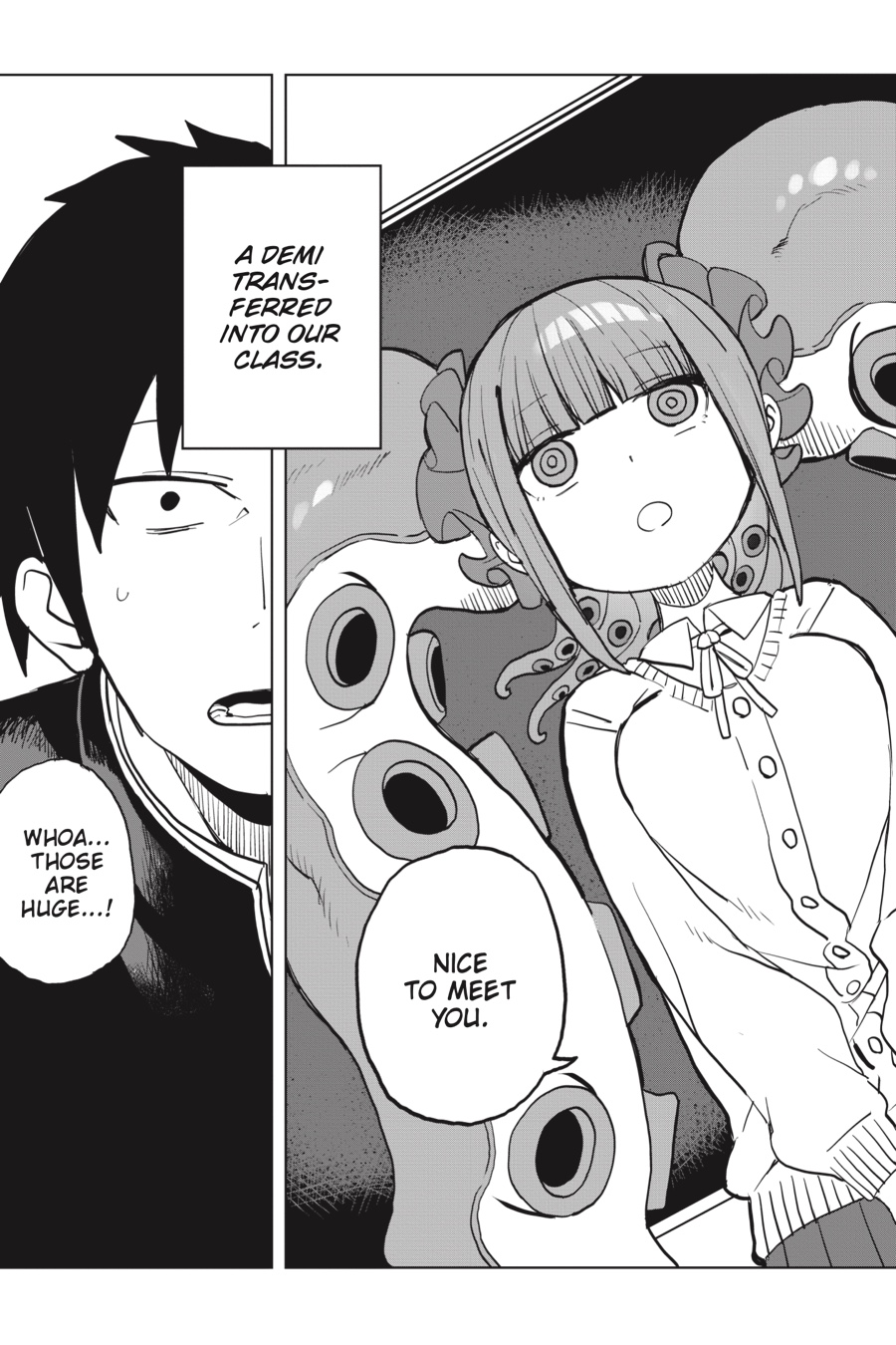 Cute, mysterious, and a little bit scary!! Kanisuke Akigai’s school life is as ordinary and settled as can be. Tests to pass, girls to feel awkward around, perverted class clowns to bicker with, and a seat by the window, perfect for daydreaming…But dreams may be more than dreams, as Kanisuke’s wandering thoughts of rare and interesting demi-humans foretell the coming of a certain eldritch transfer-student cutie, Mizudako-chan—half girl, half octopus, all clingy!