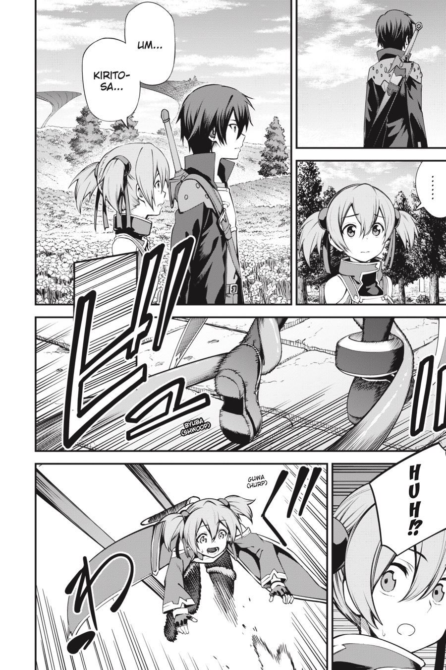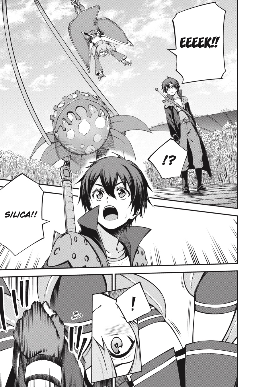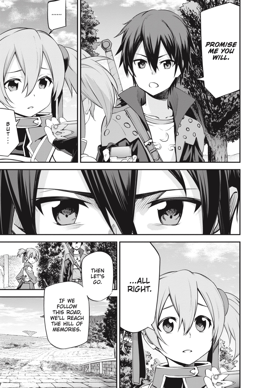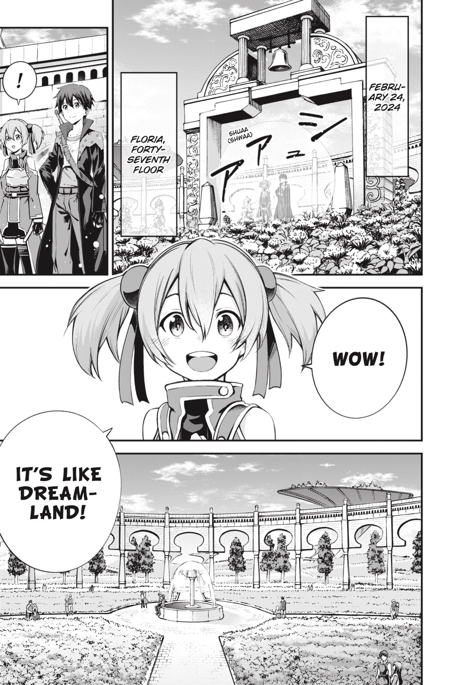 Having sworn to help Silica on her quest to obtain the revival item she needs to bring her beloved Pina back to life, Kirito accompanies her to the forty-seventh floor. There, the two team up to defeat a group of plant monsters to obtain their prize, but Kirito’s work is only getting started. He returns to town—a so-called safe zone where mobs can’t spawn and weapons are deactivated—to find that there’s been a murder! Will he and Asuna be able to uncover the truth behind this mysterious killing and put a stop to the one behind it…?