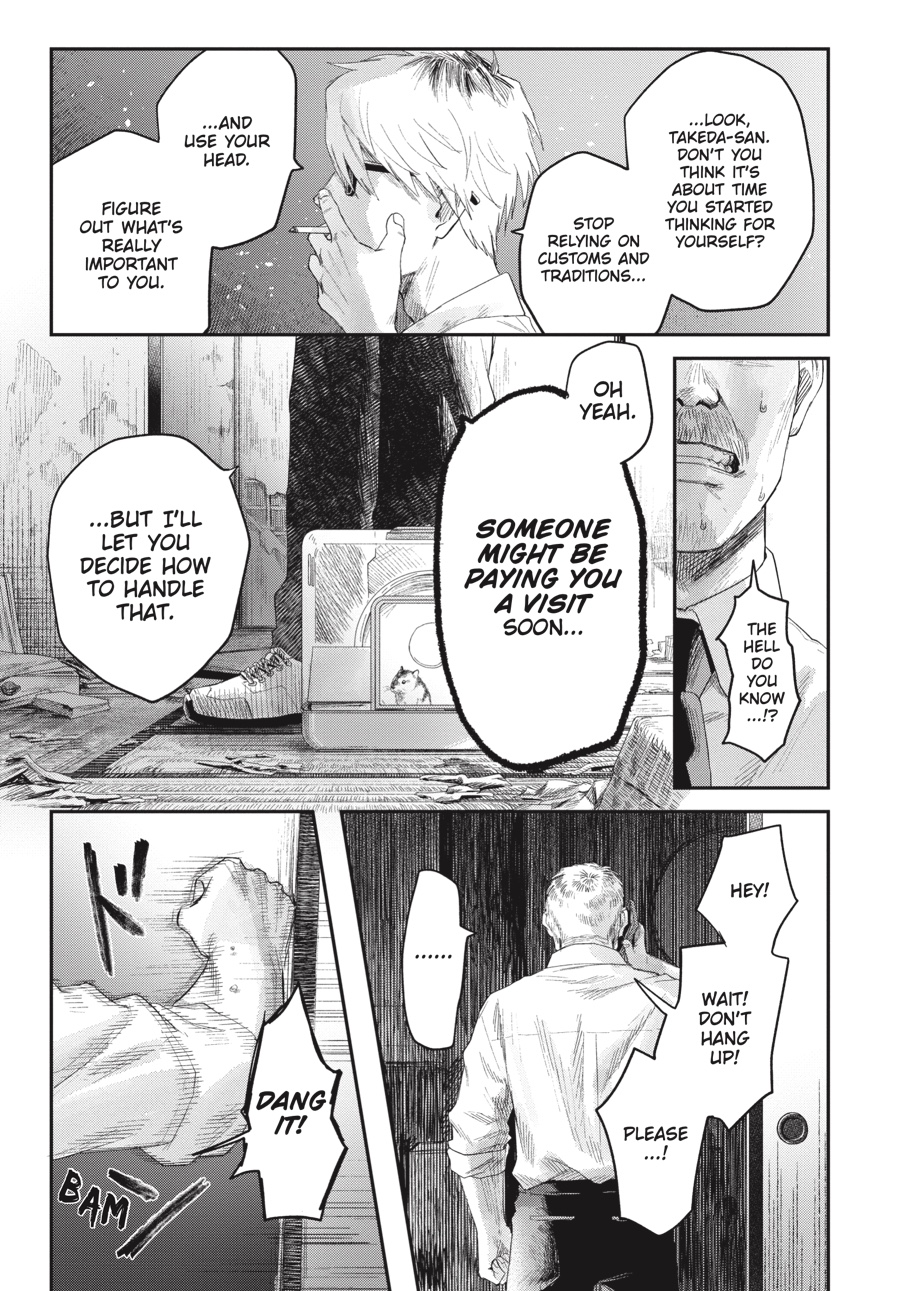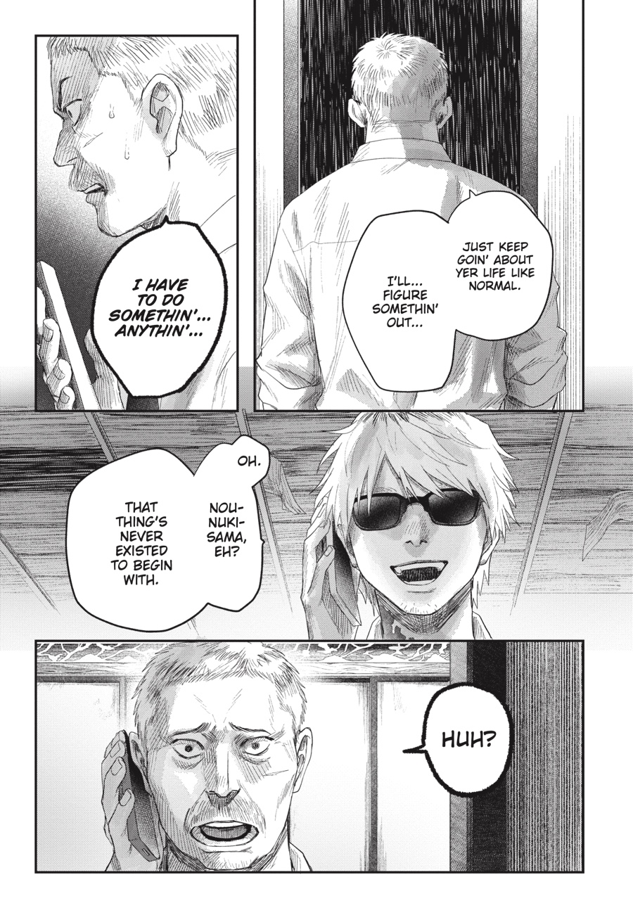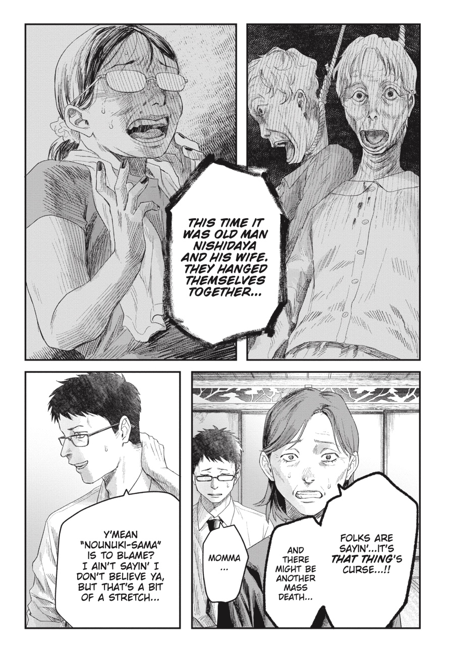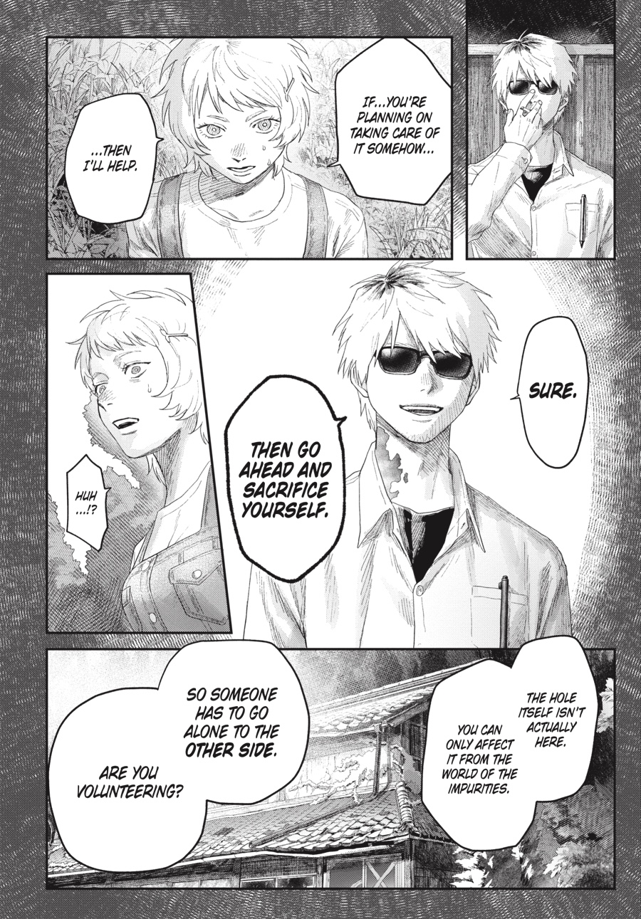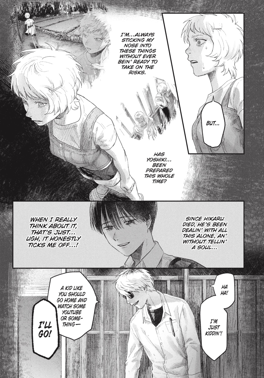 Yoshiki and “Hikaru” learn from Tanaka that the only way to stop impurities from flooding the villages is to close the “holes” letting them through. The catch? Holes can only be closed from the other side—and once a living human crosses over, there’s no way back. With that in mind, “Hikaru” makes a daring proposition: seeing as he isn’t human, he can patch the hole and return using his connection with Yoshiki. Meanwhile, Asako and Tanaka try an entirely different tactic—convincing an impurity to do the job for them!